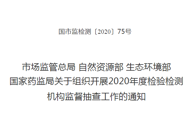 2020年5月14日,市場監(jiān)管總局、自然資源部、生態(tài)環(huán)境部、國家藥監(jiān)局聯(lián)合發(fā)布了《關于組織開展2020年度檢驗檢測機構監(jiān)督抽查工作的通知》。通知顯示,為加強檢驗檢測機構監(jiān)管,營造公平有序的市場環(huán)境,為疫情防控和經(jīng)濟社會發(fā)展提供技術支撐,市場監(jiān)管總局、自然資源部、生態(tài)環(huán)境部和國家藥監(jiān)局決定于2020年6月至10月在全國范圍內組織開展檢驗檢測機構“雙隨機、一公開”監(jiān)督抽查。