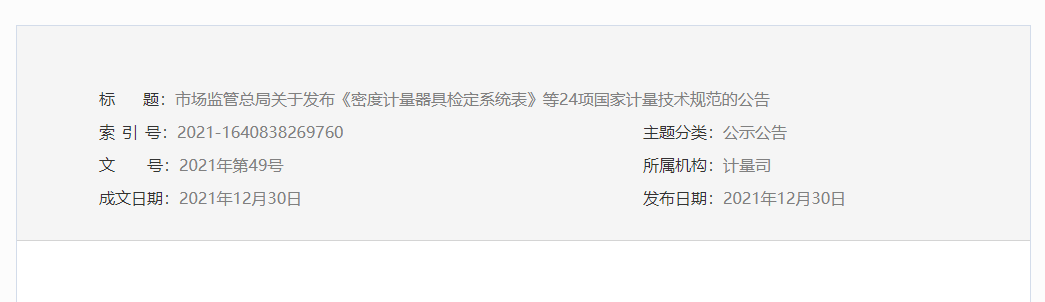 市場監(jiān)管總局關(guān)于發(fā)布《密度計量器具檢定系統(tǒng)表》等24項國家計量技術(shù)規(guī)范的公告