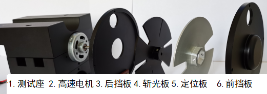 1測試座、 2高速電機、3后防護擋板、4斬光板、5定位板和6前防護擋板
