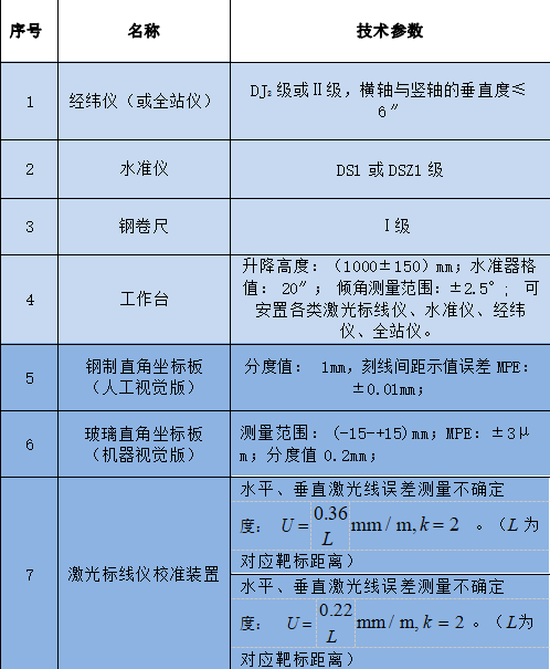 激光標線儀校準裝置主要技術參數(shù)如表 1 所示,校準方式分為機器視覺和人工視覺兩種方法,表格中淺藍色部分為兩種校準方式共用的儀器和技術參數(shù)。