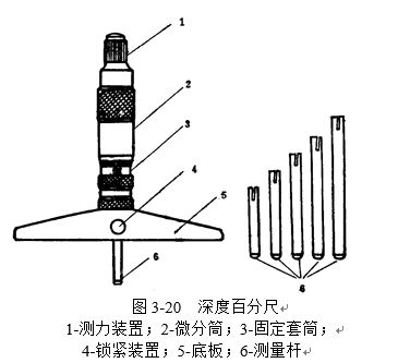 深度百分尺測量孔深時,應(yīng)把基座5的測量面緊貼在被測孔的端面上。零件的這一端面應(yīng)與孔的中心線垂直,且應(yīng)當(dāng)光潔平整,使深度百分尺的測量桿與被測孔的中心線平行,保證測量精度。此時,測量桿端面到基座端面的距離,就是孔的深度。
