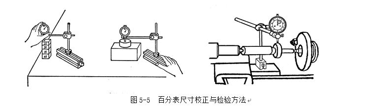 3 用百分表校正或測(cè)量零件時(shí),如圖5-5所示。應(yīng)當(dāng)使測(cè)量桿有一定的初始測(cè)力。即在測(cè)量頭與零件表面接觸時(shí),測(cè)量桿應(yīng)有0.3~1mm的壓縮量(千分表可小一點(diǎn),有0.1mm即可),使指針轉(zhuǎn)過(guò)半圈左右,然后轉(zhuǎn)動(dòng)表圈,使表盤的零位刻線對(duì)準(zhǔn)指針。輕輕地拉動(dòng)手提測(cè)量桿的圓頭,拉起和放松幾次,檢查指針?biāo)傅牧阄挥袩o(wú)改變。當(dāng)指針的零位穩(wěn)定后,再開始測(cè)量或校正零件的工作。如果是校正零件,此時(shí)開始改變零件的相對(duì)位置,讀出指針的偏擺值,就是零件安裝的偏差數(shù)值。