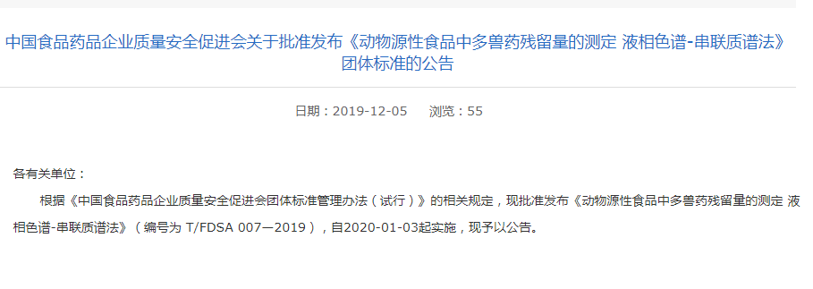 近日,中國食品藥品企業(yè)質(zhì)量安全促進會發(fā)布了關(guān)于《動物源性食品中多獸藥殘留量的測定 液相色譜-串聯(lián)質(zhì)譜法》團體標(biāo)準(zhǔn)的公告。公告中稱,該標(biāo)準(zhǔn)將于2020年1月3號正式實施。