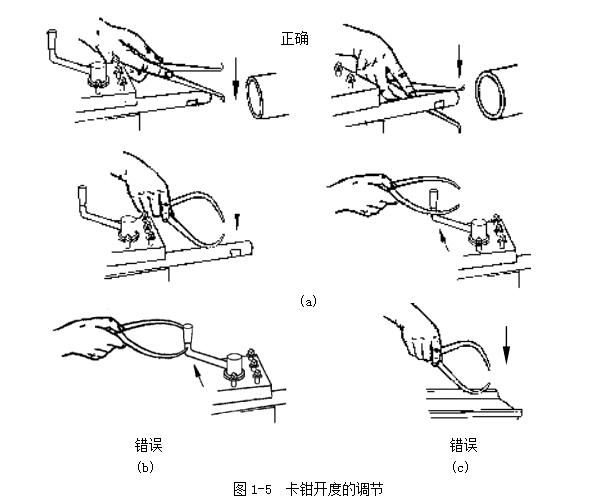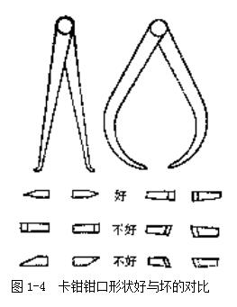 首先檢查鉗口的形狀,鉗口形狀對(duì)測(cè)量精確性影響很大,應(yīng)注意經(jīng)常修整鉗口的形狀,圖1-4所示為卡鉗鉗口形狀好與壞的對(duì)比。