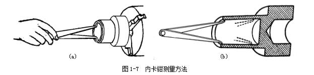 用內(nèi)卡鉗測(cè)量?jī)?nèi)徑時(shí),應(yīng)使兩個(gè)鉗腳的測(cè)量面的聯(lián)線正好垂直相交于內(nèi)孔的軸線,即鉗腳的兩個(gè)測(cè)量面應(yīng)是內(nèi)孔直徑的兩端點(diǎn)。因此,測(cè)量時(shí)應(yīng)將下面的鉗腳的測(cè)量面停在孔壁上作為支點(diǎn)(圖1-7a),上面的鉗腳由孔口略往里面一些逐漸向外試探,并沿孔壁圓周方向擺動(dòng),當(dāng)沿孔壁圓周方向能擺動(dòng)的距離為最小時(shí),則表示內(nèi)卡鉗腳的兩個(gè)測(cè)量面已處于內(nèi)孔直徑的兩端點(diǎn)了。再將卡鉗由外至里慢慢移動(dòng),可檢驗(yàn)孔的圓度公差,圖1-7b 所示。