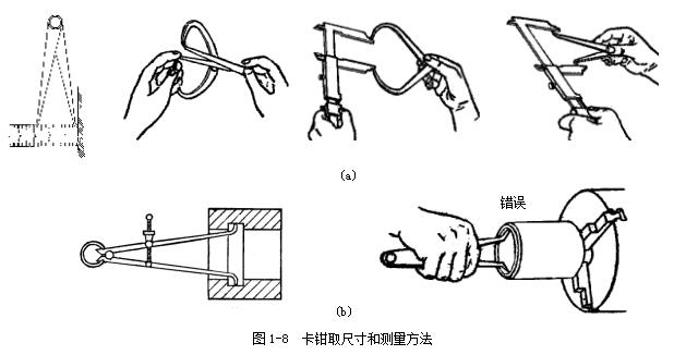 用巳在鋼直尺上或在外卡鉗上取好尺寸的內(nèi)卡鉗去測(cè)量?jī)?nèi)徑,圖1-8a 所示。就是比較內(nèi)卡鉗在零件孔內(nèi)的松緊程度。如內(nèi)卡鉗在孔內(nèi)有較大的自由擺動(dòng)時(shí),就表示卡鉗尺寸比孔徑內(nèi)小了;如內(nèi)卡鉗放不進(jìn),或放進(jìn)孔內(nèi)后緊得不能自由擺動(dòng),就表示內(nèi)卡鉗尺寸比孔徑大了,如內(nèi)卡鉗放入孔內(nèi),按照上述的測(cè)量方法能有1~2mm的自由擺動(dòng)距離,這時(shí)孔徑與內(nèi)卡鉗尺寸正好相等。測(cè)量時(shí)不要用手抓住卡鉗測(cè)量,圖1-8b 所示,這樣手感就沒有了,難以比較內(nèi)卡鉗在零件孔內(nèi)的松緊程度,并使卡鉗變形而產(chǎn)生測(cè)量誤差。