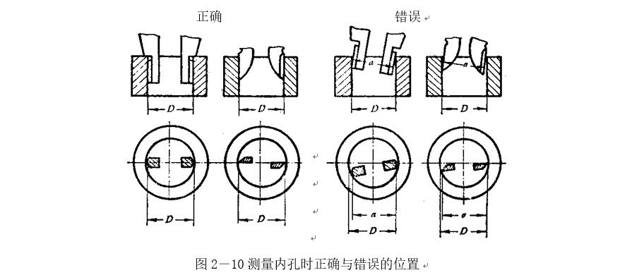 卡尺兩測(cè)量刃應(yīng)在孔的直徑上,不能偏歪。圖2-10為帶有刀口形量爪和帶有圓柱面形量爪的游標(biāo)卡尺,在測(cè)量?jī)?nèi)孔時(shí)正確的和錯(cuò)誤的位置。當(dāng)量爪在錯(cuò)誤位置時(shí),其測(cè)量結(jié)果,將比實(shí)際孔徑D要小。